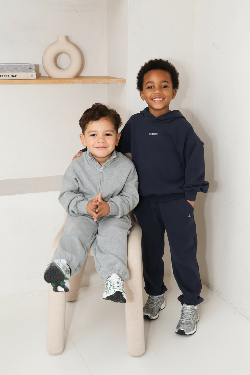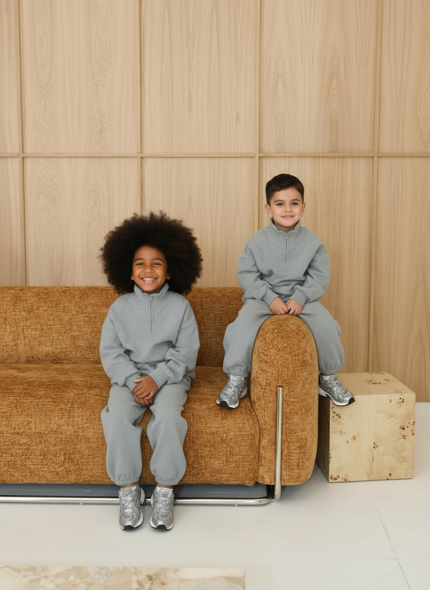 De set is gevoerd en van zacht materiaal gemaakt, perfect voor rennen, springen en chillen. Verkrijgbaar in een prachtige Ash Grey kleur die overal bij past. De perfecte combinatie van comfort, stijl en slimme details waar zowel kinderen als ouders blij van worden!